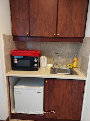 kitchenette ada microwave, peti ais, pinggan, gelas